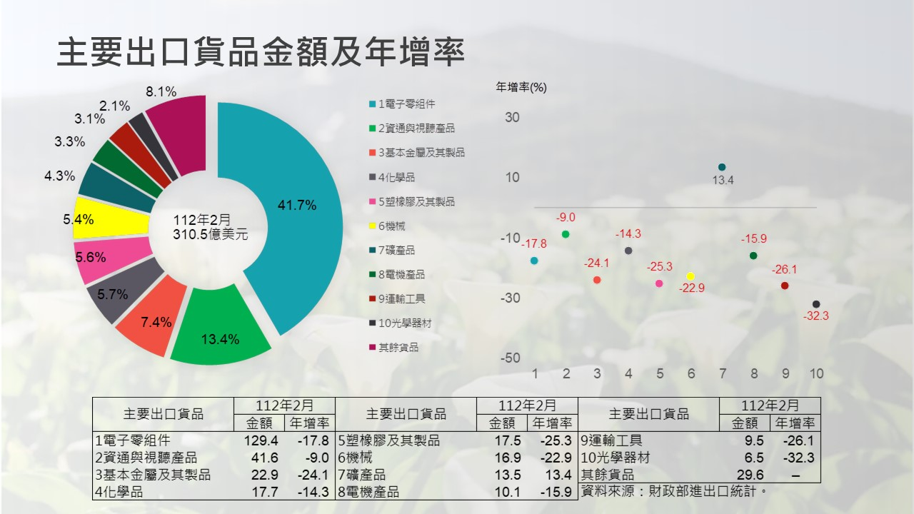 1.出口:2月出口310.5億美元,年增率-17.1%;累計1-2月出口625.6億美元,年增率-19.2%。
